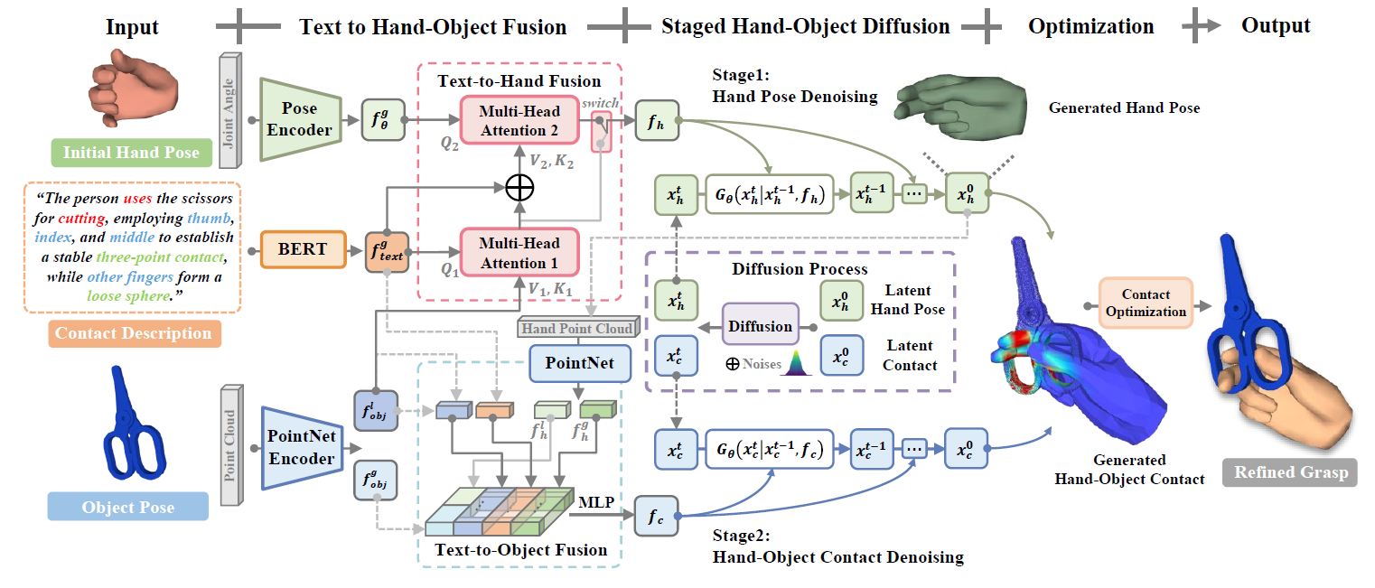 | NL2Contact pipeline. We propose a novel method to model 3D hand-object contact using language description. Our framework is composed of 1) a Text-to-Hand-Object Fusion module, efficiently fusing the geometry information from both point clouds and semantic information from natural language, 2) a staged latent diffusion model to first generate the hand pose fitting the hand description and then generate the 3D hand-object contact map conditioned on the descriptions and the generated hand pose. 3) contact optimization, which iteratively optimizes the hand pose using the generated contact. We also added a switch to toggle between its application for grasp pose optimization and human grasp generation. |