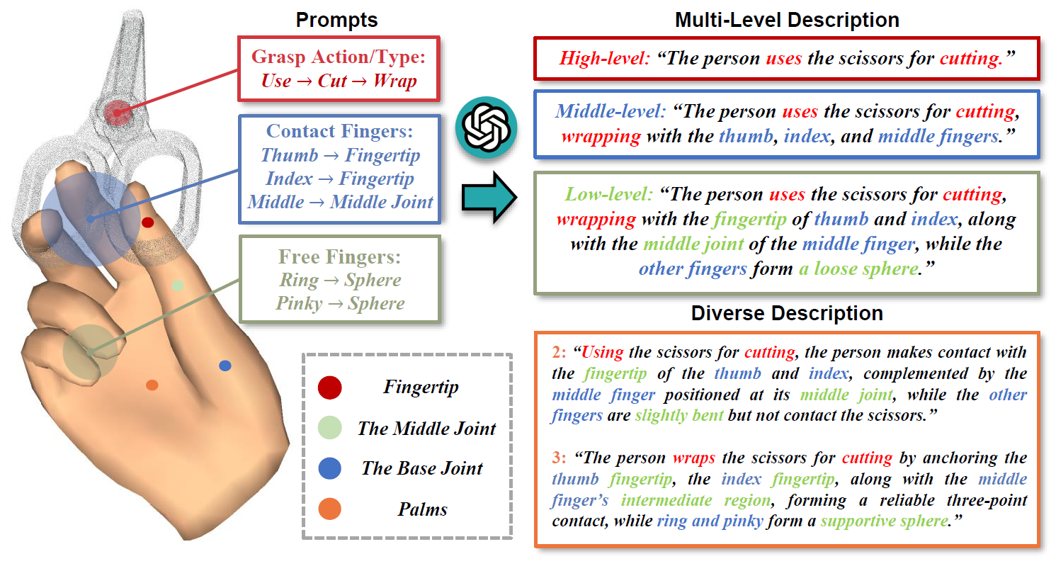 | An example of the dataset with multi-level language descriptions. Given the proposed hand-centered contact prompts, our dataset leverages ChatGPT3 to generate multi-level and diverse free-form text descriptions of contact patterns. |
