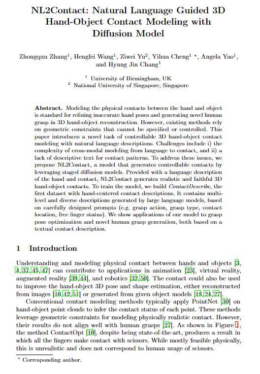 | Modeling the physical contacts between the hand and object is standard for refining inaccurate hand poses and generating novel human grasp in 3D hand-object reconstruction. However, existing methods rely on geometric constraints that cannot be specified or controlled. This paper introduces a novel task of controllable 3D hand-object contact modeling with natural language descriptions. Challenges include i) the complexity of cross-modal modeling from language to contact, and ii) a lack of descriptive text for contact patterns. To address these issues, we propose NL2Contact, a model that generates controllable contacts by leveraging staged diffusion models. Provided with a language description of the hand and contact, NL2Contact generates realistic and faithful 3D hand-object contacts. To train the model, we build ContactDescribe, the first dataset with hand-centered contact descriptions. It contains multi-level and diverse descriptions generated by large language models, based on carefully designed prompts (e.g. grasp action, grasp type, contact location, free finger status). We show applications of our model to grasp pose optimization and novel human grasp generation, both based on a textual contact description. |